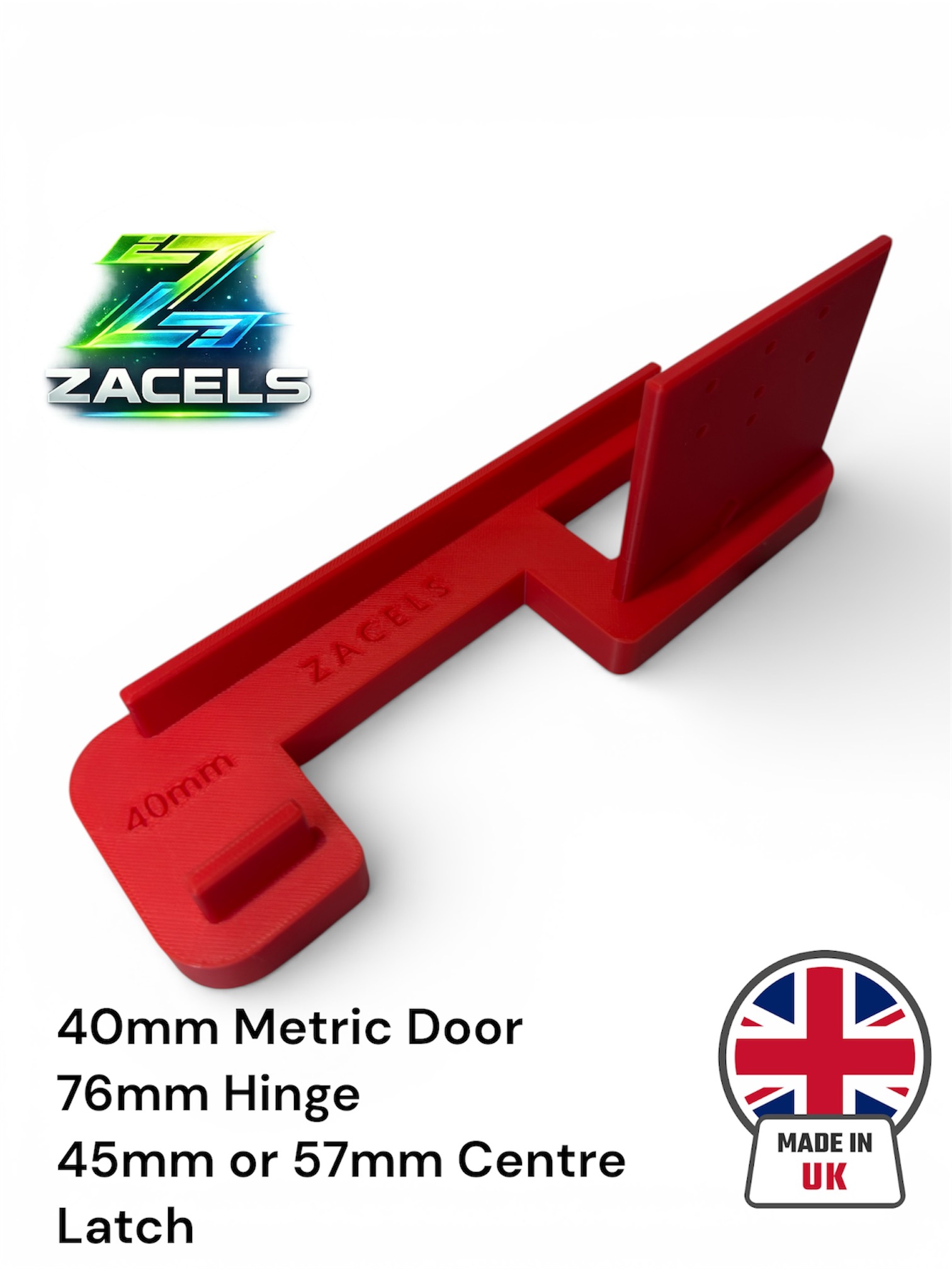 This Zacels Door Hinge and Latch Jig is for a 40mm (METRIC SIZE) door with 76mm Hinges and either a 45mm or 57mm centre Latch. Other models are available for Metric size doors 40mm. Please see other listings